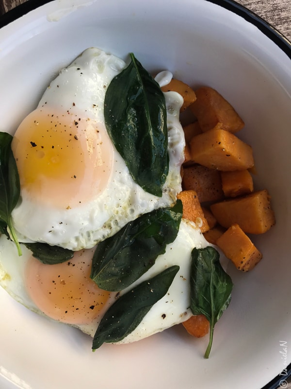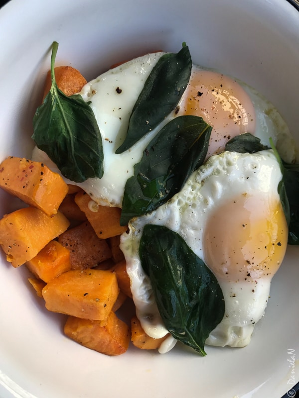 Altfel cam așa cum am făcut eu astăzi. Am înlocuit felia de pâine cu un minunat cartof dulce, care nu doar că este foarte gustos, are o mulțime de beneficii pentru sănătate și este o sursă minunată de vitamine.