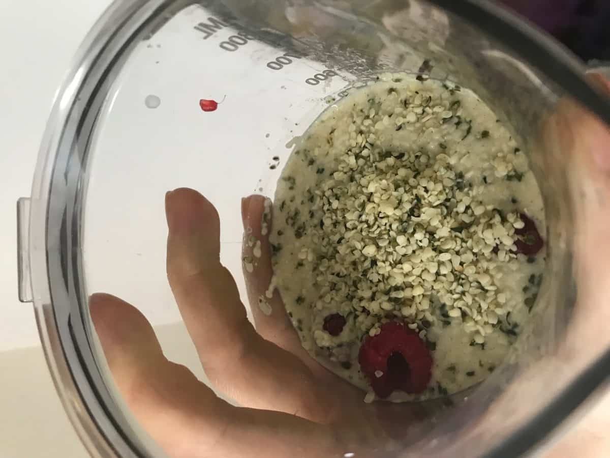 Mic dejun: smoothie cu zmeură, semințe de cânepă și lapte de migdale (300 ml lapte de migdale, 3 linguri zmeură + 1 lingură semințe de cânepă)