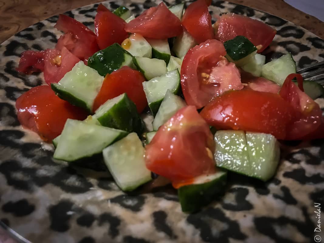 Prânz: friptură de porc la cuptor + salată de roșii și castraveți