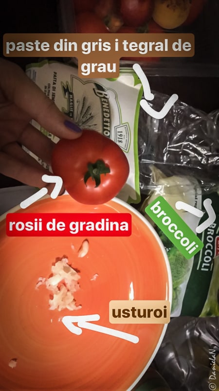 - Într-o farfurie am amestecat cuburile de roșii cu usturoiul și busuiocul, la final am adăugat și pastele cu broccoli, am stropit cu un ulei de măsline aromat și am presărat puțin parmezan.