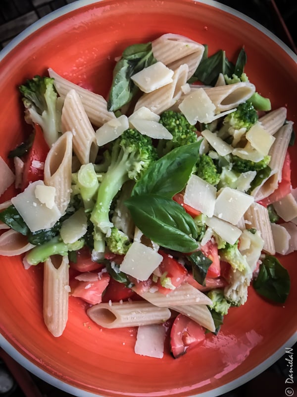 Cină: paste din griș de grâu integral, broccoli, busuioc, usturoi, roșii și parmezan