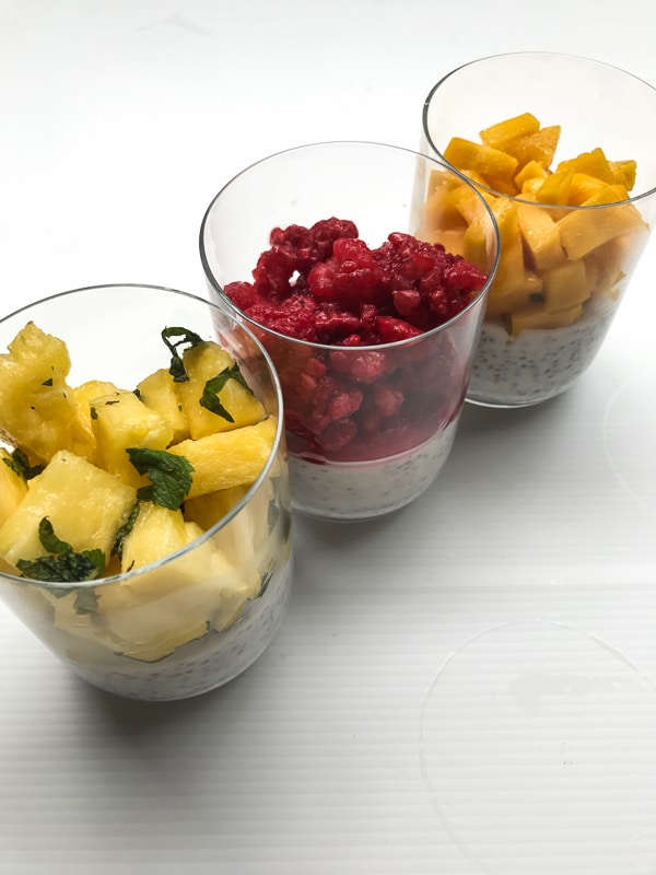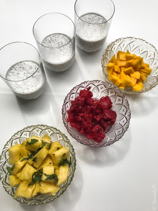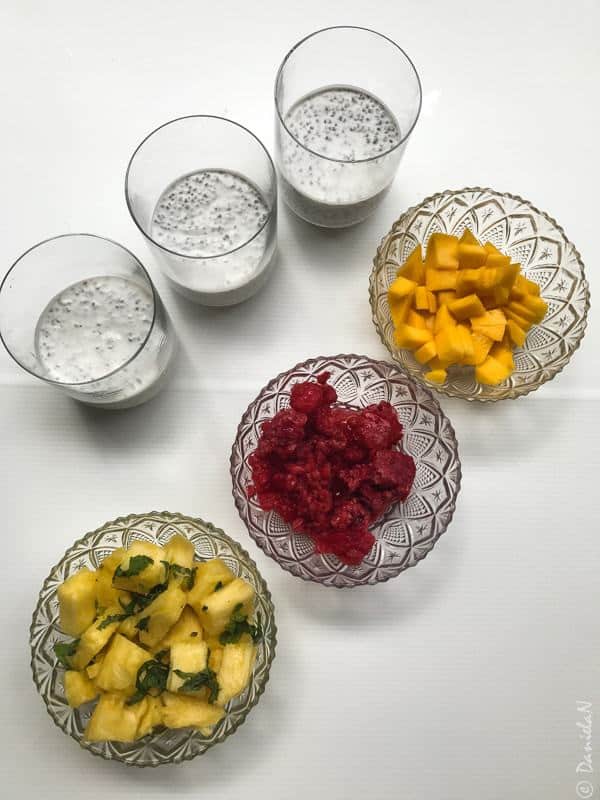 Laptele de cocos l-am amestecat cu sucul de lămâie și cu semințele de chia. Din amestecul obținut am distribuit în mod egal în 3 pahare și le-am lăsat la frigider pentru 30 de minute, timp în care semințele au început să se umfle și amestecul s-a legat.