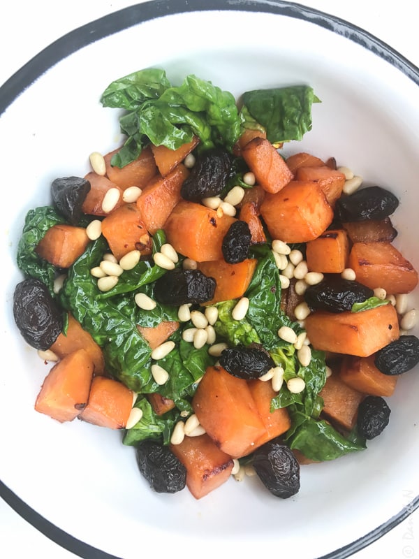 Cină: salată de kale cu cartof dulce, semințe de pin și măsline kalamata
