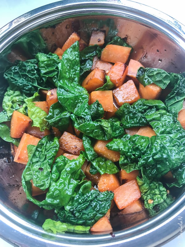 Cartoful dulce tăiat cuburi mici și l-am gătit într-o tigaie antiaderentă cu o lingură de ulei de măsline. Am acoperit tigaia cu un capac și am lăsat pentru 10-15 minute, dar am amestecat din când în când. În ultimele 2 minute am pus peste cartof și varza kale tocată.
