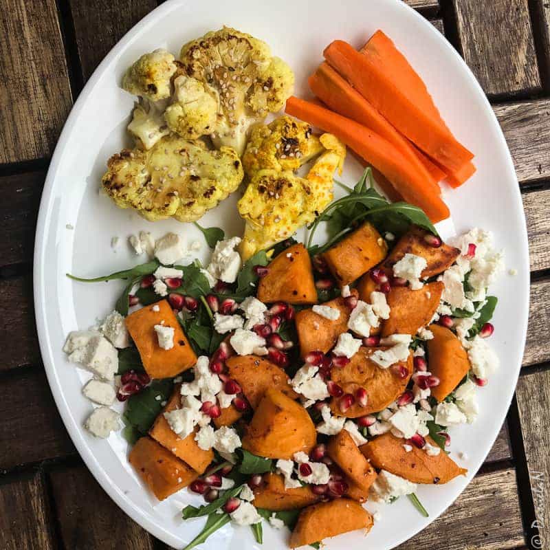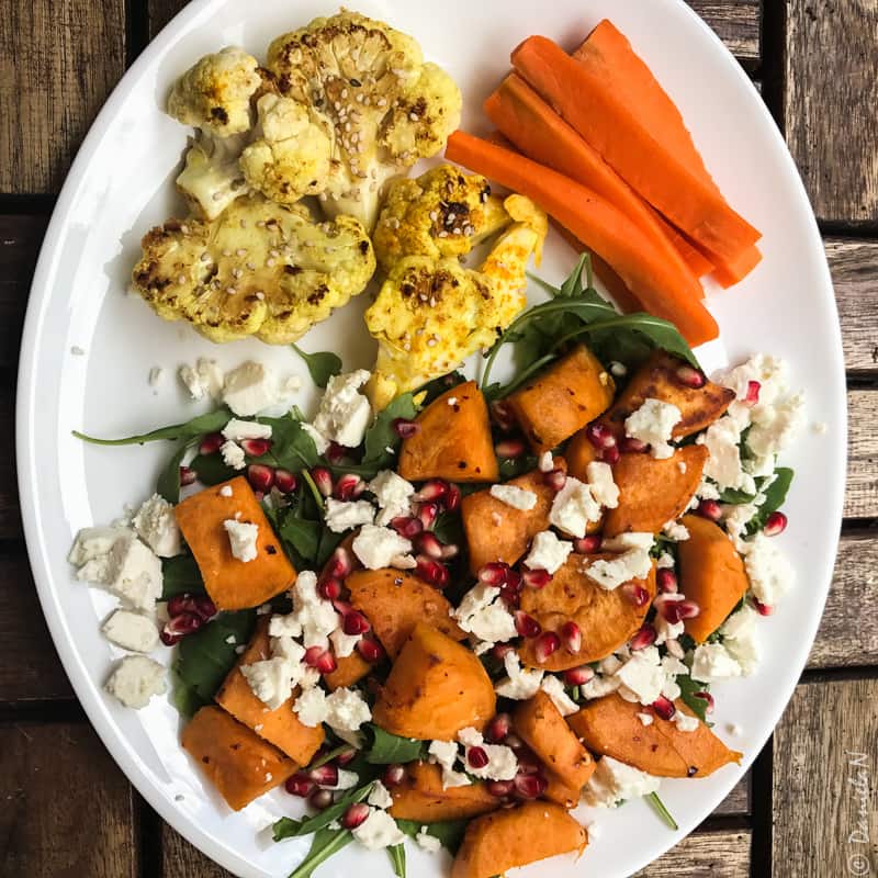 Conopidă super aromată cu turmeric, cartof dulce, brânză feta, rodie și rucola