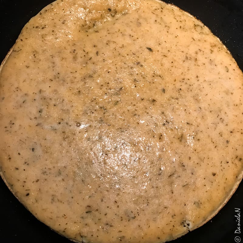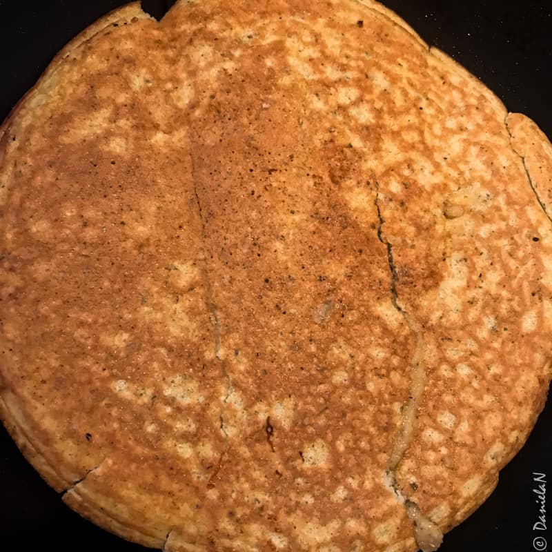 Am uns o tigaie antiaderentă cu ulei de cocos, am încns-o bine și am turnat în ea aluatul. Am lăsat focul la mic și am întors blatul după 4 minute. Este important ca focul să fie lăsat la mic pentru a nu arde blatul.