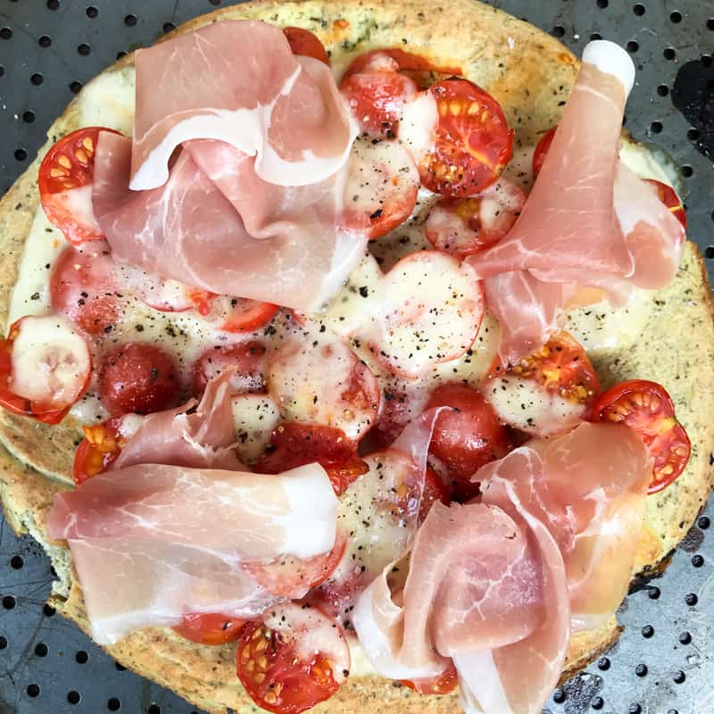 Pentru Domnul B am folosit sos de roșii, mozzarella din belșug și prosciutto, iar blatul este doar din albușuri, testând astfel ambele variante.