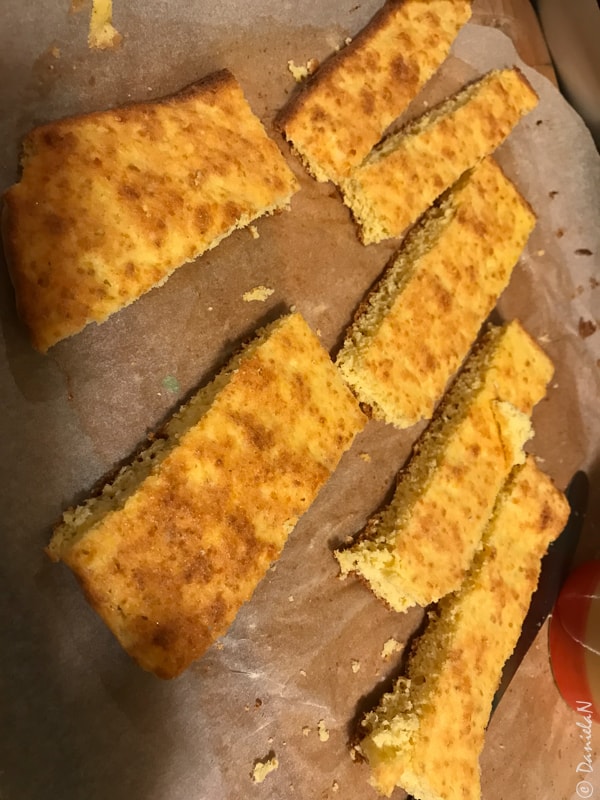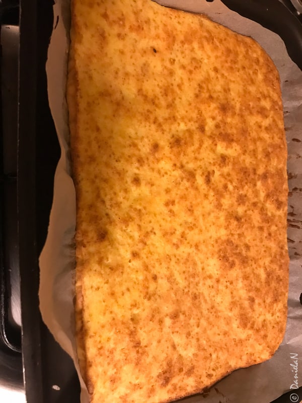 Într-o tavă dreptunghiulară, având dimensiunea de 30X22 cm, am pus hârtie de copt și apoi am turnat compoziția. Am introdus tava în cuptorul preîncălzit la 200 de grade pentru 15 minute.