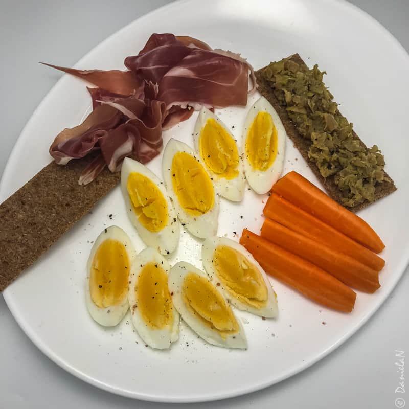 Înainte de antrenament: 2 ouă fierte, 1 morcov crud, 3 felii prosciutto crudo, 1 pâine crocantă de secară cu unt de dovlecei