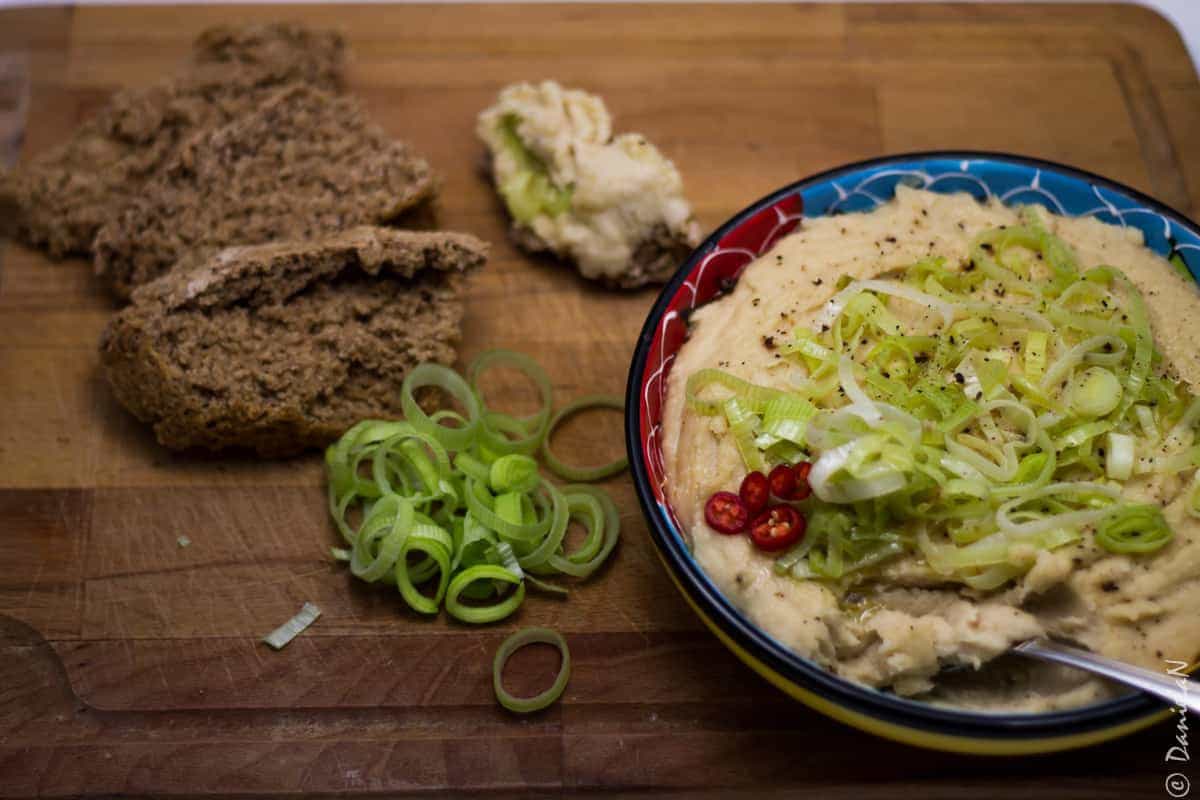 Fasolea băuttă se stropește cu ulei de măsline, i se pune prazul deasupra, se fotografiază dacă este cazul, apoi se savurează musai pe o felie de pâine integrală, proaspăt scoasă din cuptor!