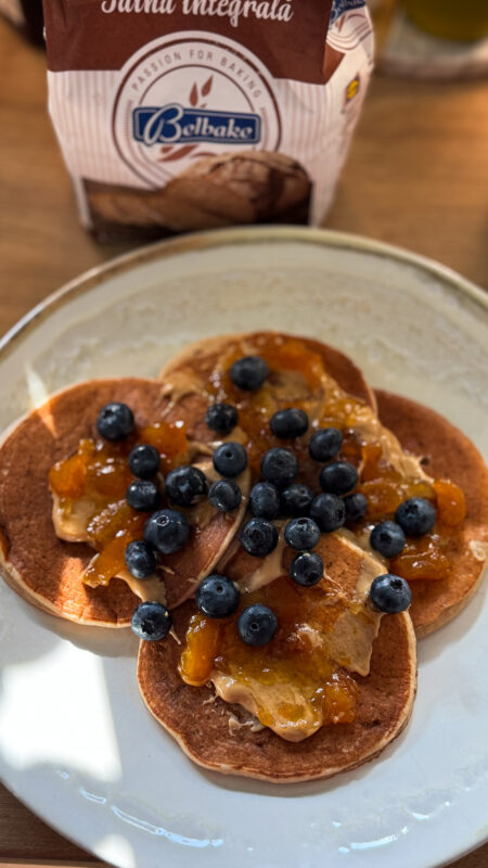 Masa 1: pancakes cu făină integrală servite cu unt de arahide, dulceață și afine proaspete