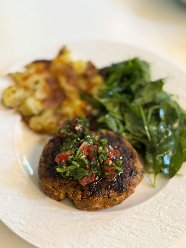 Masa 3: burger de curcan cu salată de spanac, sos chimichurri și cartofi zdrobiți la cuptor/ pentru Domnul B – steak de vită cu cartofi zdrobiți și salată