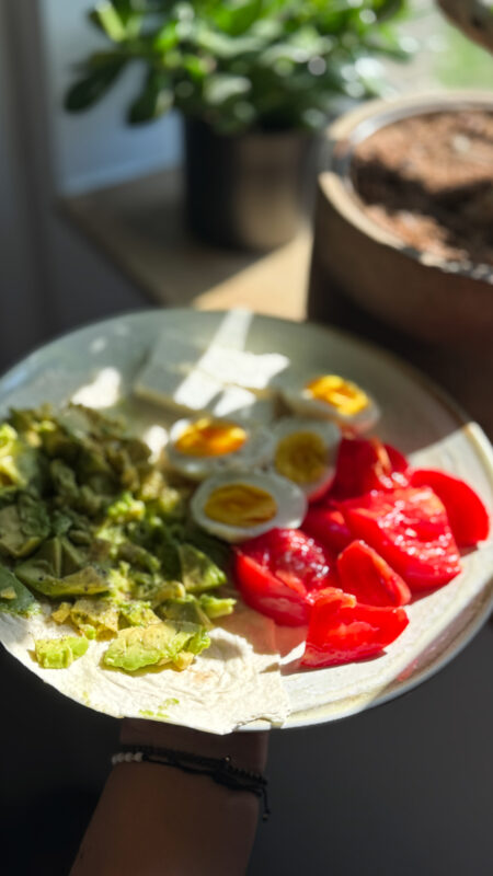 Masa 1: ou fiert + avocado zdrobit, brânză feta și roșie / pentru Alexia ou fiert cu roșie, parmezan și măsline
