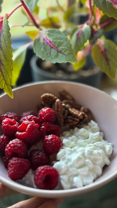 Gustări: brânză cottage + zmeură și nuci pecan/ pepene roșu