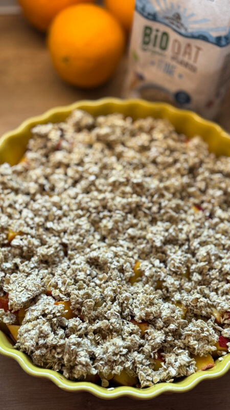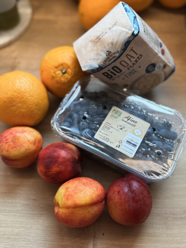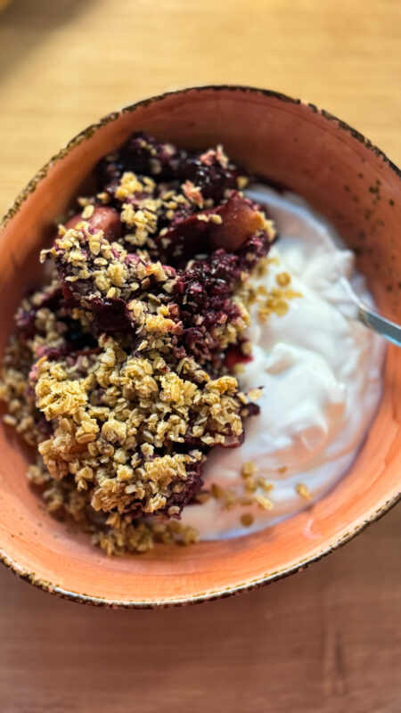 Masa 1: crumble cu afine și nectarine servit cu iaurt grecesc/ pentru Alexia smoothie cu iaurt, fructe de pădure congelate și nuci caju