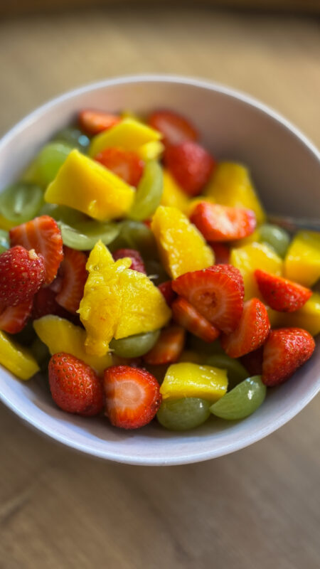 Gustări: crumble cu afine/ salată cu căpșune, struguri și mango