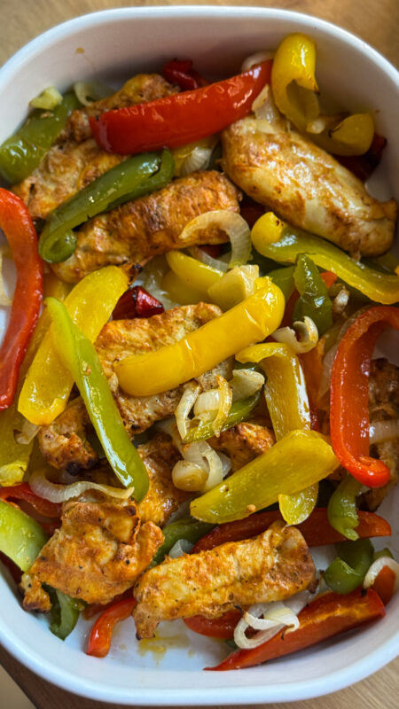 Masa 3: fajitas cu piept de pui, ardei gras și ceapă albă + guacamole