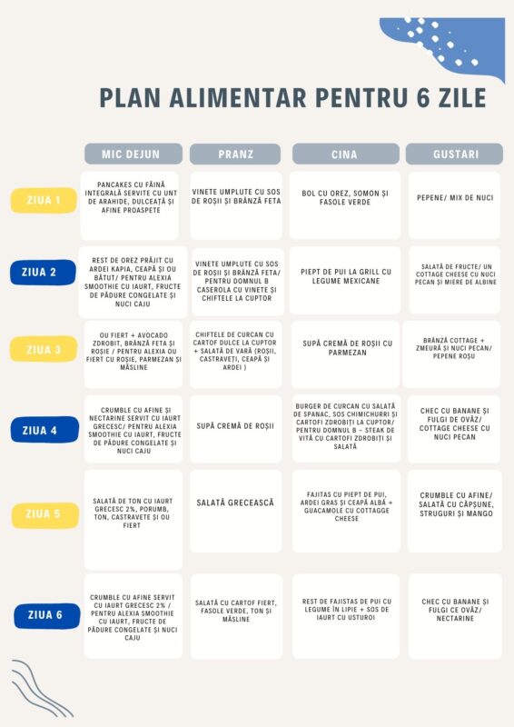 Planul alimentar pentru 6 zile cuprinde inspirație pentru cele 3 mese principale ale zilei și idei de gustări. În general, mesele echilibrate și gustările simple, au rolul de a oferi organismului energia necesară pentru fiecare zi, și te feresesc de acele gustări nepotrivite precum covrgiei, chips-uri, dulciuri și așa mai departe.