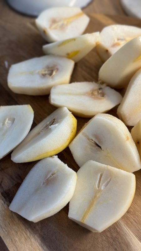 1️⃣Curățăm perele de coajă și sâmburi, apoi le feliem și le stropim cu zeamă de lămâie să nu se oxideze.