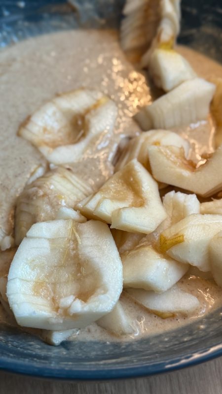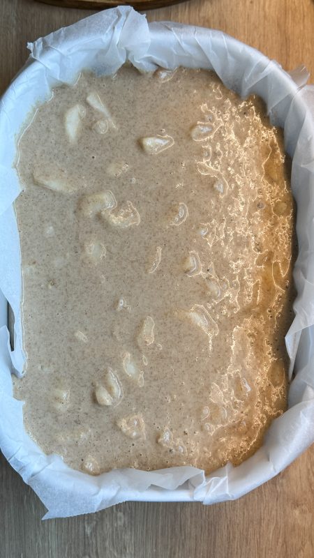 3️⃣Adăugam în compoziție și perele apoi transferăm amestecul într-o formă pt cuptor tapetată cu hârtie de copt.