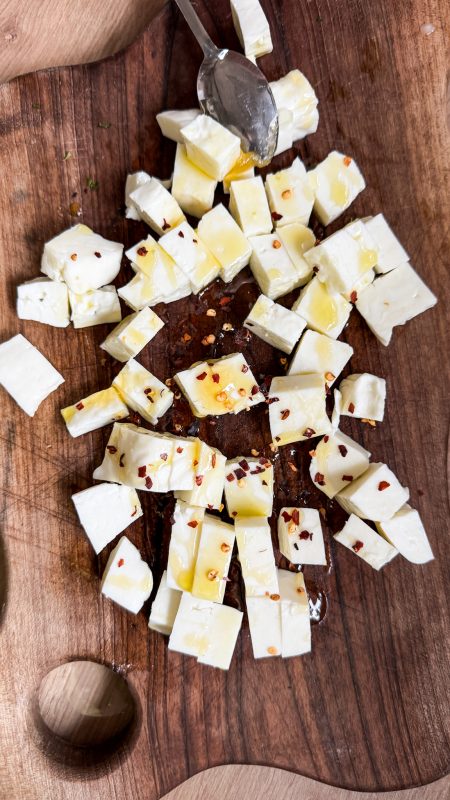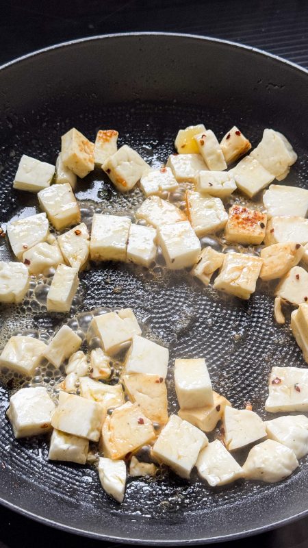 Brânza halloumi am tăiat-o în cuburi, am stropit-o cu ulei, miere și fulgi de chilli, apoi am rumenit-o în tigaie.