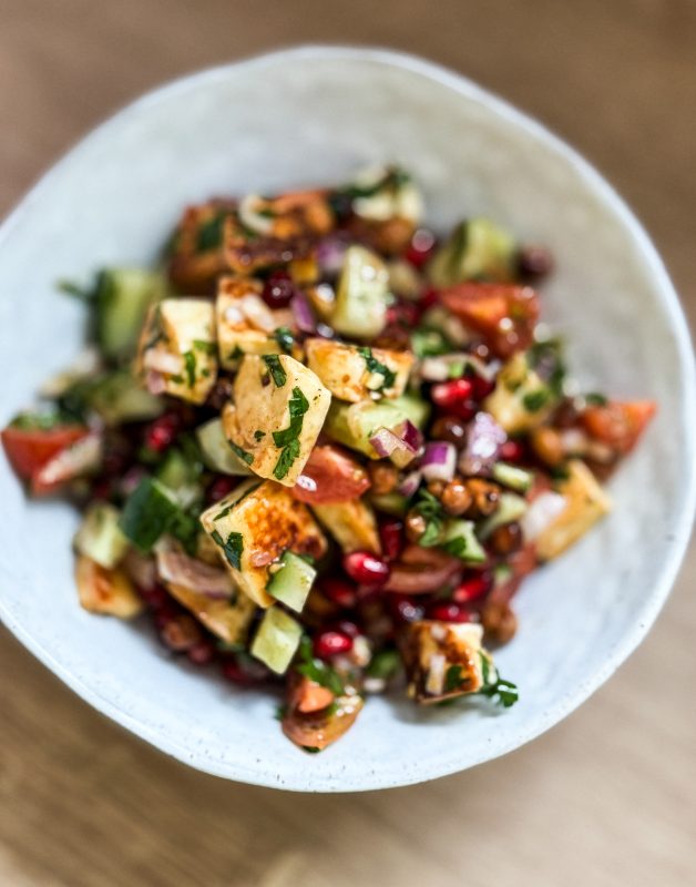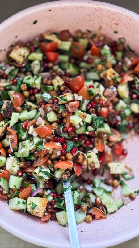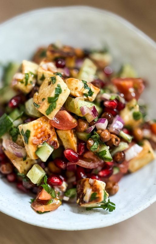 Separat am tocat restul ingredientelor și le-am amestecat într-un castron, la final am adăugat năutul, halloumi, rodia și dressingul care a completat de excepție întregul tablou plin de gust și culoare.