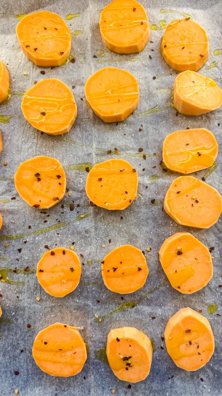 Cartoful dulce l-am tăiat rondele (nu foarte subțiri, cam la 1 cm) apoi l-am uns cu ulei de măsline pe ambele părți și l-am condimentat cu sare. Piperul sau fulgii de chili pot fi folosite și ele după gust, eu nu mă feresc de iute, deci am cam pus fulgi.
