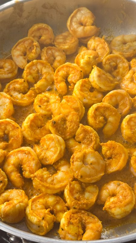 Creveții i-am gătit separat, într-o tigaie, când încep să își schimbe culoarea, veți ști că sunt gata.