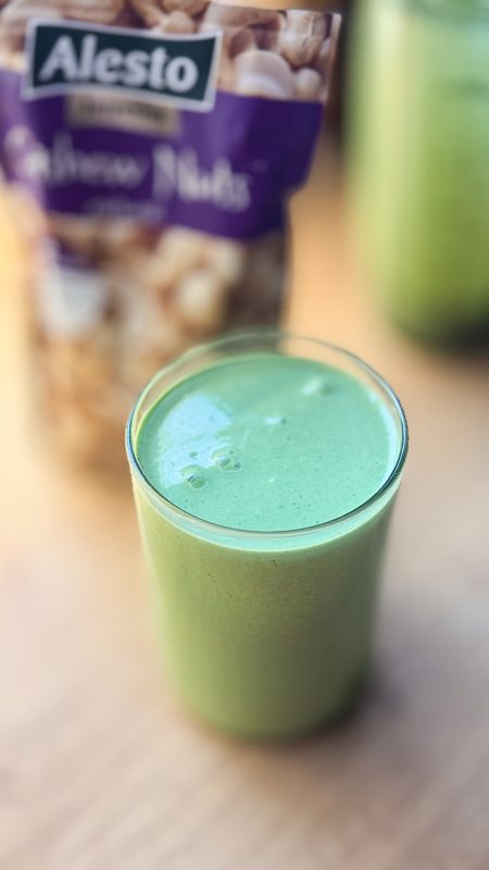Masa 1: smoothie cu iaurt grecesc, baby spanac și banană/ pentru Alexia smoothie cu cottage cheese, fructe de pădure congelată și caju