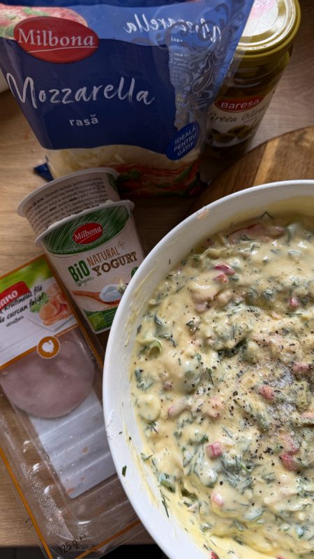 Am folosit iaurt, șuncă de pui, măsline verzi, ardei gras și o cantitată generoasă de verdeață.