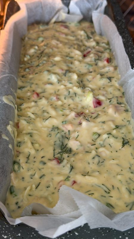 Am integrat făina amestecată cu praful de copt pe care am integrat-o în amestecul lichid, apoi am completat cu restul ingredientelor – măslinele feliate, mozzarella deja dată pe răzătoare, verdeața tocată, sunca de pui tăiată în cuburi, ardeiul tocat în cuburi, și am condimentat cu sare și piper.